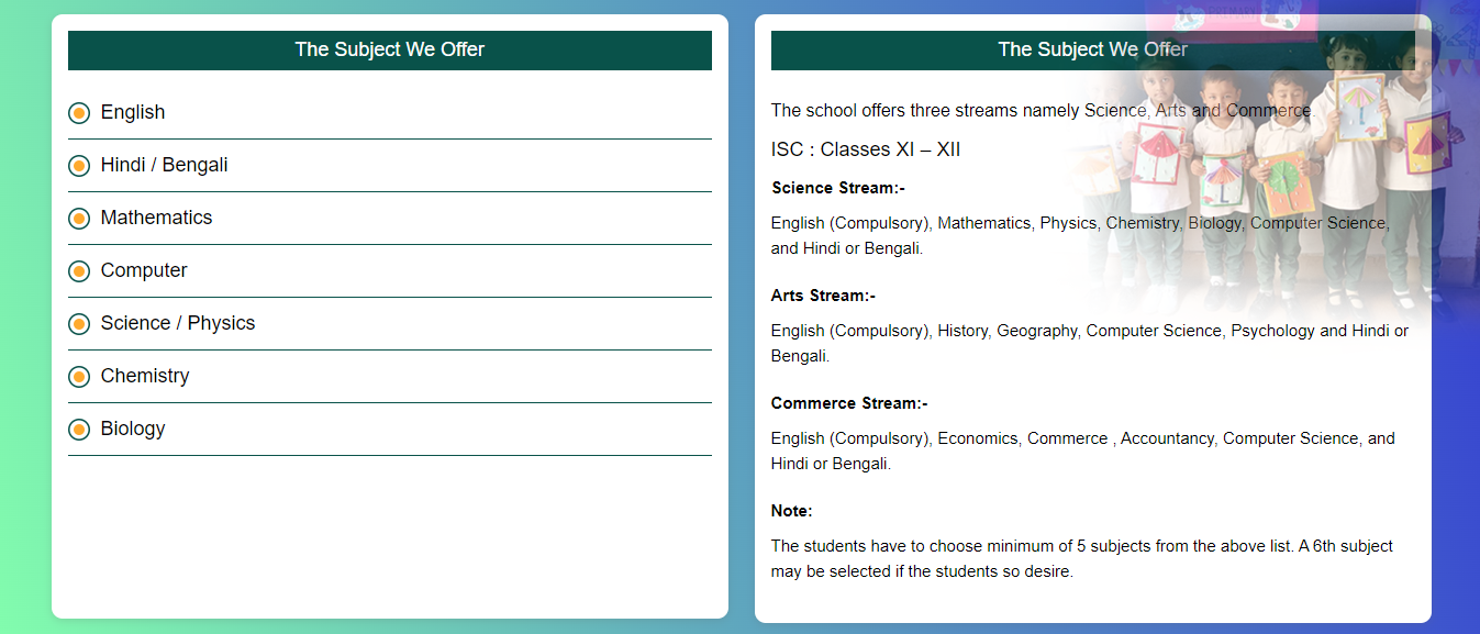 Student merit and performance are assessed through a system of continuous evaluation in the primary classes through a series of planned class tests. The School strictly follows grading system in order to avoid unhealthy competition and comparisons among children. The yearly curriculum is broken up into two terms. Assessment sheets are regularly maintained in order to update the child’s progress. Promotion is not granted if a student has less than 75%attendance, if he/she fails to appear in the annual examination or if he/she fails to secure 40% in each subject. In all matters regarding promotion, Principal’s decision is final.